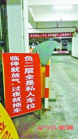 莲花广场的停车场有两层,在负一层的道闸处墙上,一块红底白字的标语格外醒目,上面印着“负二层全是私人车位 临停就放气、过夜就拖车”。