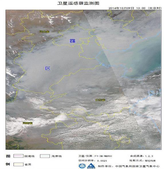 据气象卫星监测,9日白天,北京、天津、河北、山东西北部、河南北部等地仍存在重度霾天气;下午,上述地区重度霾天气仍持续,霾区范围有所扩大。