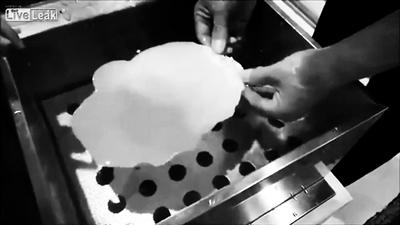 在微博上,这组动态图名为“被这圆生菜的制作工艺吓哭了”,已被转发近两千次,这里的“圆生菜”,就是朋友圈中的“圆白菜”。画面中,制作者先是将白色的液体缓缓流入热水中,形成圆生菜的菜心,再在白色的周围流入绿色的液体,形成圆生菜的菜叶。
