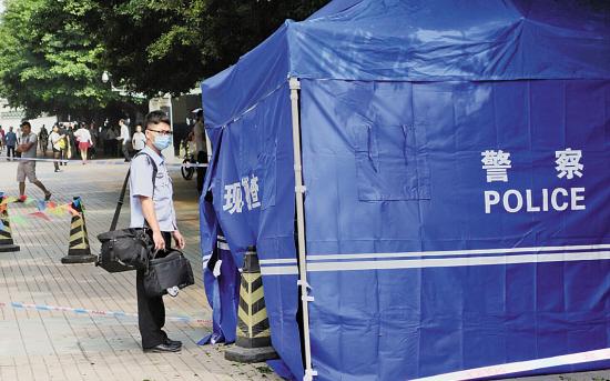 羊城晚报记者昨天11时许来到事发现场时,发现警方已到场维持秩序。死者躺卧的地方,已被一警用帐篷覆盖,有法医进出帐篷,对尸体进行检验。不少路人在美国银行中心楼下的人行道旁围观。只见大楼高处,有几处窗户是打开的。