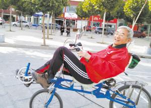经过两年多的反复试验和调试,一辆可以躺着骑的自行车终于完工。“骑车时关键在于起步,腿要伸直用力踩下去,行进起来后就会很舒服,上身完全放松,像躺在躺椅上一样。”老人自豪地说,由于骑车人躺下时风阻变小,脚蹬起来更加省力,即使连续骑行三四个小时,也不会很累。(记者 王彬)