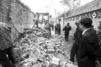 张老汉侵街占道拉围墙种菜,村委会多次制止无效后,将张老汉诉至法院。张老汉败诉,围墙被强制拆除,此后他又将墙垒起。村委会又将张老汉诉至法院并胜诉。昨天上午,房山法院执行法官带领法警前往现场,动用挖掘机等工具再次将围墙强制拆除。