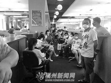 10月12日,闽侯上街万科又一城销售中心内,数十名身穿统一样式白色T恤、戴着口罩的业主将办公场所“攻占”,并打出条幅要求开发商退房,事情最终不了了之。