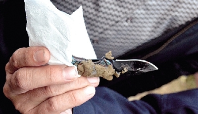 民警在围栏东侧的泥坑内找到被蓝衣青年扔的刀子,是一个带扣刀子,属管制刀具之列。