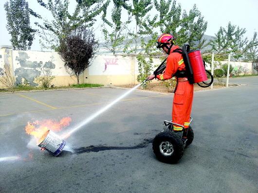 单兵消防平衡车机动灵活,配备了细水雾灭火装置。