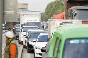 北二环跨红星街桥附近车流密集,一些赶时间的司机不得不从沥青石子上碾轧过去,还有不少车辆选择从桥下辅路过,导致辅路也发生拥堵。据闫女士介绍,堵车最严重时发生在8时许,北二环从西三庄至红星街五六公里长路段,都挤满了车。因担心造成更大面积堵车,他们当时暂停了清理工作。
