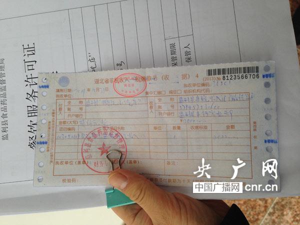 食药监局的工作人员给尹神普开了一张2000元的收据,盖有监利县食品药品监督管理局的公章。在二楼这间办公室待了约40分钟后,尹神普拿着这张收据到五楼,10分钟之内,一张办餐饮许可证就被打印出来。