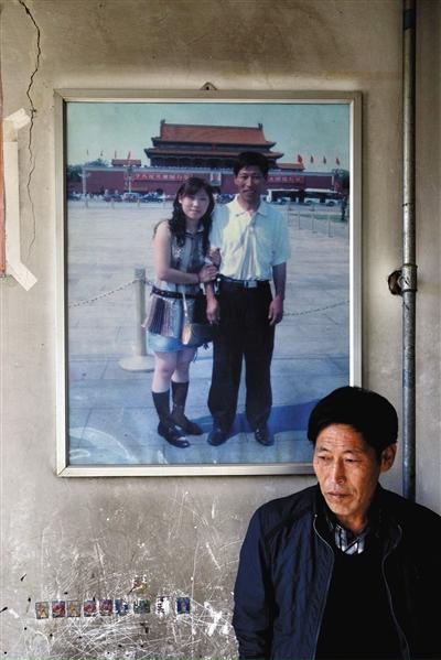 11月14日,承德市平泉县,潘小梅父母的家,潘小梅父亲靠在墙上,身后挂着数年前他和潘小梅在北京的合影照片。新京报记者 王嘉宁 摄