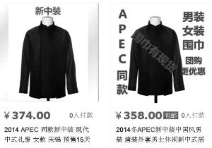 APEC会议上首次亮相的“特色中式服装”,引起了社会公众的关注,一些网店的掌柜迅速“嗅到”商机,纷纷推出同款服装(如图)。昨天,服装面料供应商表示只提供私人定制,其他商家无权使用同款面料,网上热销的同款服装均为仿制。