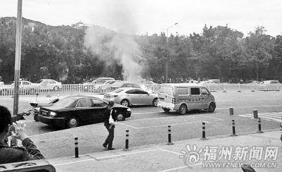福州一小车行驶突自燃 加油站员工助阵灭火