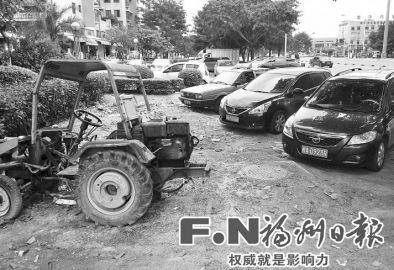16日下午,记者在现场看到,南国金辉小区大门外两侧约50米长的绿化带上停放着不少机动车,其中不乏拖拉机和货车,成片的绿化带已裸露出黄土和石砾。