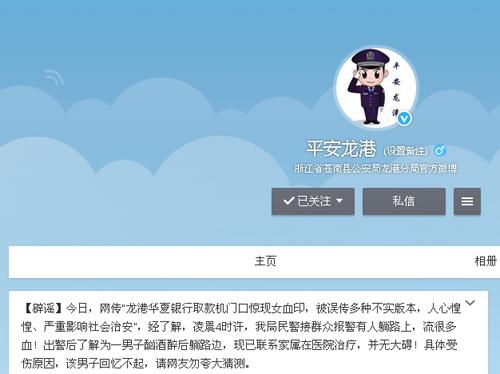 今日,网曝一则“浙江龙港某银行取款机门口惊现女血印”的消息引发网友的关注。对此,浙江省苍南县公安局龙港分局官方微博发布消息称,此消息不实,被误传多种版本,使得人心惶惶,给社会治安造成严重影响。