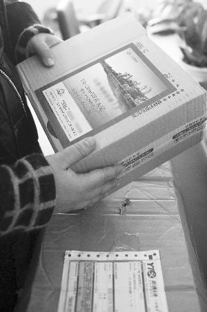 昨日,记者看到了李女士手中的这个快递箱。从外观上看,在箱子的两面分别粘有快递单据和地产广告,这则彩色的地产广告长约20厘米、宽约15厘米,与快递单大小差不多。在这则地产广告上明确地标注了地产公司的咨询电话及地址等信息。