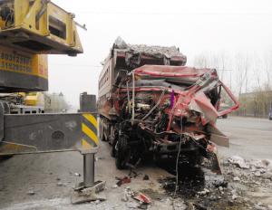 昨日上午8时许,记者在事发现场看到,两台大型吊车已经将被撞翻的列车车厢吊起扶正,并拖到附近一家铁路单位院内。车厢被撞凹的侧面,还散落着汽车雨刷、保险杠和石渣等。肇事的保定牌照大货车驾驶室被撞烂,冷却液和柴油流淌满地。在附近的地面上,散落着列车车厢上被撞掉的刹车缸等零件。肇事大货车的车厢经过两次加高,装载的是大块石渣,估计有近百吨重。大货车所有车轮下面,均看不到有刹车痕迹。