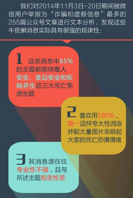 第一期的报告主题为“你最想掐死的小道消息”,研究人员通过对2014年11月3日-20日期间被微信用户举报为“诈骗和虚假信息”最多的255篇公众号文章进行文本分析,发现了很强的规律性:即“焦虑主题”、“夸大渲染”以及“信源不明”。