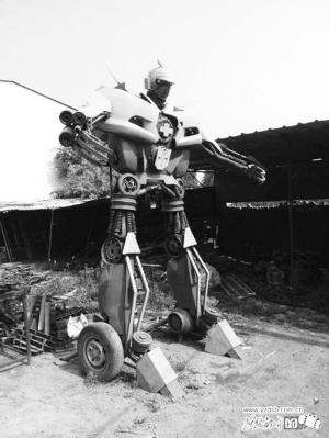 姚福兴介绍说,第一件作品“大黄蜂”耗费了5个月的时间,用了上百种零件,大多是废旧汽车、摩托车和建材配件。“三米半高,重约一吨,当时制作完成后好多人都来看。”有了第一次的制作经验后,第二件作品“擎天柱”只用三个月就完成了,“‘擎天柱’高4.3米,重一吨半,还安装了开关,眼睛可以亮,双臂可以前后摆动,同时播放电影《变形金刚》的主题曲和配音。”姚福兴说。