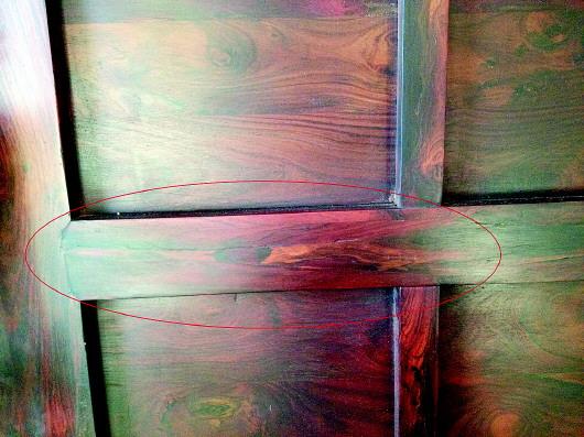 “当时店里拉着窗帘,灯光较暗,卖家的解释是红木怕晒,会褪色。”李华说,当时挑家具时关注点都在材质是不是真的,有没有添加辅材,根本没有想到拼接这回事。她看了看家具表面,感觉和书上的图片差不多。再加上商家反复强调材质不假,家具配有南京林业大学木材科学研究中心的材质认定证书,且顶箱柜里还盖有该研究中心的红木认定章,这些都打消了李华和老伴的顾虑。