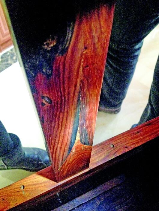 12月9日,记者随山东省红木产品质量监督检验中心主任赵松南来到李华家中。通过现场查看,赵松南指出,家具所用的木材是大红酸枝,但小料拼接现象在内里、边缘甚至表面多处存在。尤其是家具的承重部位,是由小料粘成大块再开料而成的。“小料拼接,把木性解了,并且胶有一定寿命,这些都会影响木头的强度。短时间内使用没问题,但耐用性肯定比不上整块木头制成的家具。”