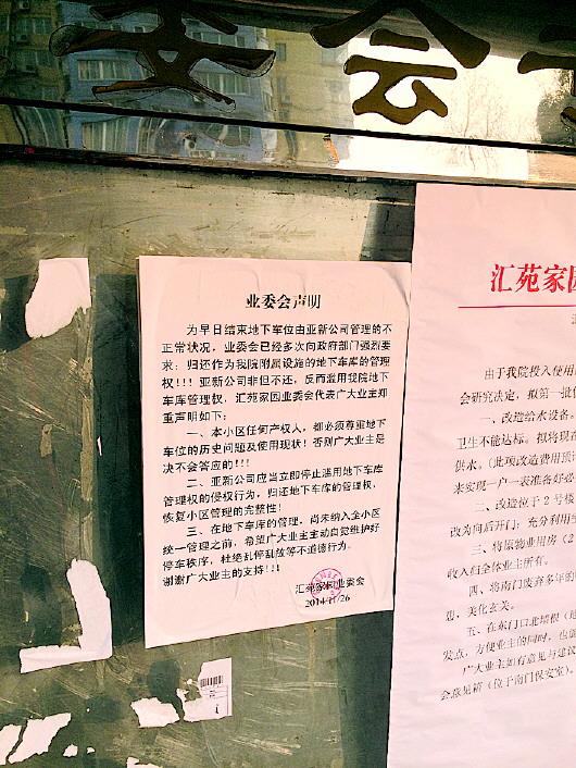 走进该小区,其宣传栏上张贴着一张“业委会声明”的通知。通知中要求“亚新公司停止滥用地下停车库管理权的侵权行为,归还地下车库的管理权”。