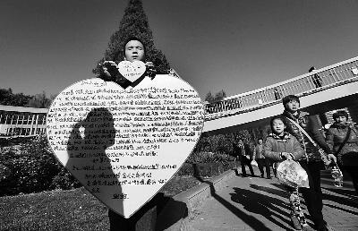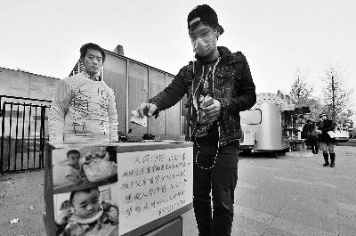 甘当“人肉沙包”的夏军在国贸附近募款时的情景 摄/法制晚报记者 刘畅
