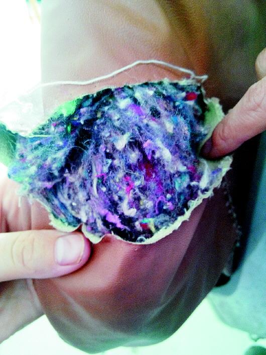 “那天骑电动车不小心把电动车的挡风被给刮破了,这才发现里面的填充物居然是黑红色的。”家住温馨花园的李女士用鼻子闻了一下,里面还有一股怪怪的味道,“翻遍了整条挡风被都没有找到合格证。”