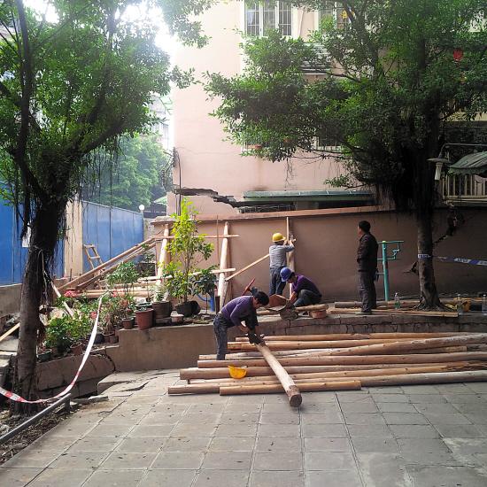 维修人员用木桩支撑下沉的围墙