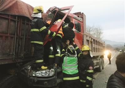 近日,溧阳市消防中队接到报警称,241省道天目湖检查站往平桥方向5公里处,两辆卡车追尾相撞,后一辆车的驾驶员被困在车中无法脱身。接到报警后,消防官兵迅速赶到现场。事故发生在19日凌晨5点多,车祸现场情况十分惨烈,在省道的一段上坡路上,一辆安徽牌照的自卸式后八轮大卡车与一辆河南牌照的满载煤炭的半挂车追尾,自卸车的整个驾驶室在猛烈的撞击下只剩下了不到三十厘米的宽度,车辆底盘嵌入半挂车车尾有将近两米的距离,附近几十米路面上散落着煤炭、零件和玻璃渣等杂物。而自卸车驾驶员右小腿被卡在车内,左腿半跪在驾驶室边缘,大半个身子几乎已经甩出车外,左手紧紧地抓住了驾驶室车门,这才没有倒挂下来。