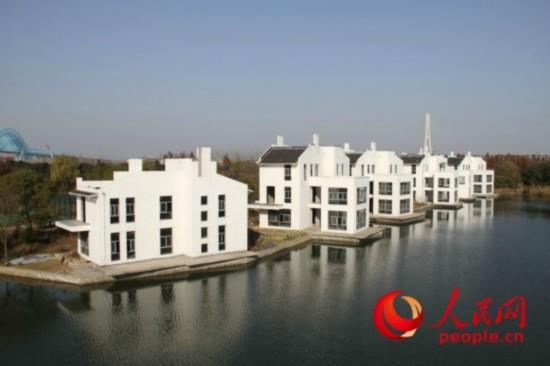 记者来到位于南京三桥旁边的水利公园,在公园靠湖的位置,这五栋白色建筑格外显眼,建筑主体已完工,外墙涂刷完毕,只是内部还未装修。建筑旁还建有一个网球场,粗略估计这五栋建筑面积在2000平米左右。附近一名村民介绍,这些建筑在2013年6月建成后便一直停工。在建筑的大门口,记者看到门头上赫然写着“老码头文化产业园”的字样,大门被木板封住,外人无法进入。