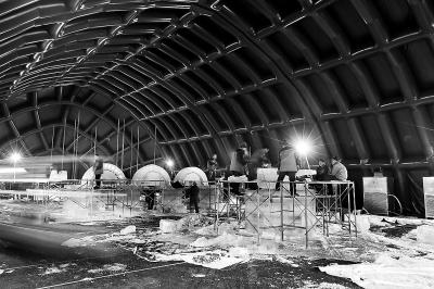 在北京制作冰展,最大的困难就是温度,工作人员在体育场内搭了几个大棚,棚内共布置了32台压缩机制冷,让棚内温度保持在零下3摄氏度到零下5摄氏度。