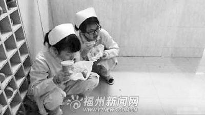 照片中,两名年轻女护士正蹲在一个鞋柜旁,戴着一次性手套,埋头吃快餐。该网友在微博上说,照片摄于福州一家医院,这是这些护士的日常夜班状态,如果遇上大规模的意外事故,她们可能连饭也吃不上。