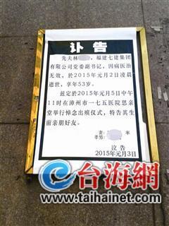 福建国企官员酒后猝死 讣告称因病医治无效亡(图)