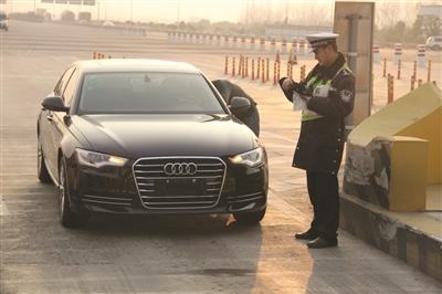 超速奥迪新车在收费站被交警拦下。 胡正金 摄