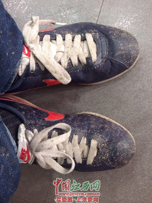 该网友当时穿的鞋子被淋湿后,全是泥沙 (本文图片来自网友微博)