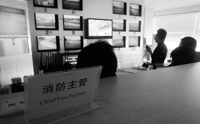 主管消防的工作人员紧盯大屏幕,关注赛道上的情况 摄/法制晚报记者 范博韬