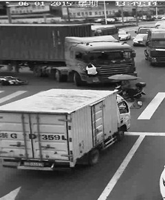 民警在路口问了一圈,没人知道电动自行车和大货车的事故,但是不久前看见有一辆大货车挡风玻璃上趴着一个人,往义乌方向开过去,非常惊险,大家以为是在拍电影。