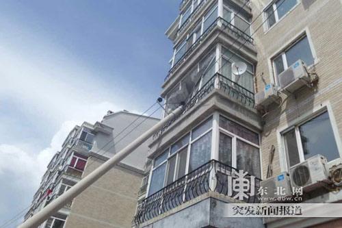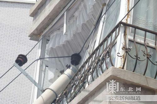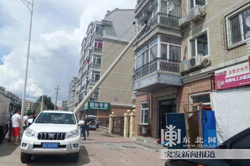 哈尔滨南棵街一电线杆被车撞倒 砸中居民阳台