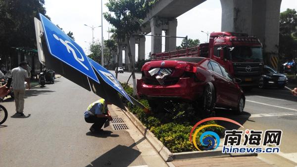 当南海网记者赶到事发现场时看到,这辆琼A牌照的红色大众轿车的尾部将这辆琼C牌照的摩托车完全压在车底,并撞倒了在路旁的交通指示牌,而轿车车头的方向也已几乎偏离原来的行驶方向,其车后部保险杠几乎脱落,车身左侧有明显刮痕。