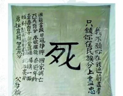 “国难当头,日寇狰狞。国家兴亡,匹夫有分。本欲服役,奈过年龄。幸吾有子,自觉请缨。赐旗一面,时刻随身。伤时拭血,死后裹身。勇往直前,勿忘本分!”左边,是父亲恨不身赴抗战和对儿子请缨杀敌的欣慰与期盼。