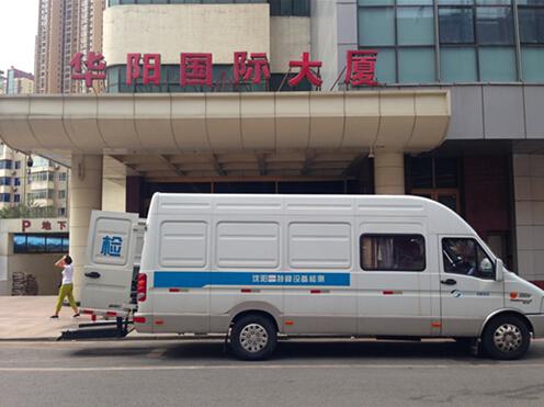 15日下午,特种设备检测车停在华阳国际大厦门前