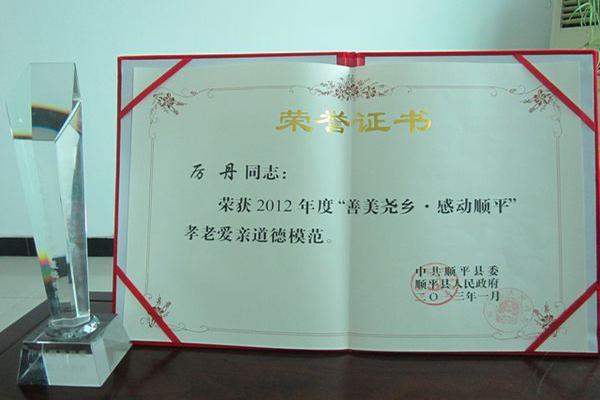 厉丹荣获2012年度“善美尧乡·感动顺平”孝老爱亲道德模范。图片来源网络