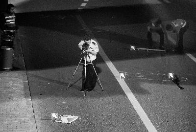 图为昨晚,警方在西直门桥下勘察,标出男子坠亡的位置(画圈处) 摄/记者 杨益