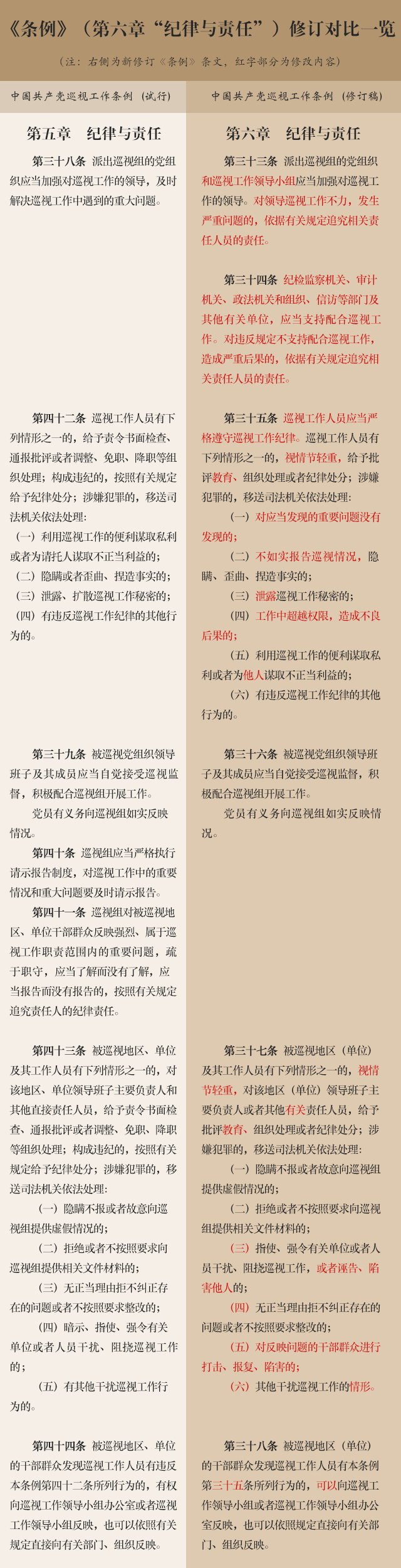 《条例》明确了被巡视党组织的配合责任,规定对干扰、阻挠、妨碍巡视工作的行为进行追责。