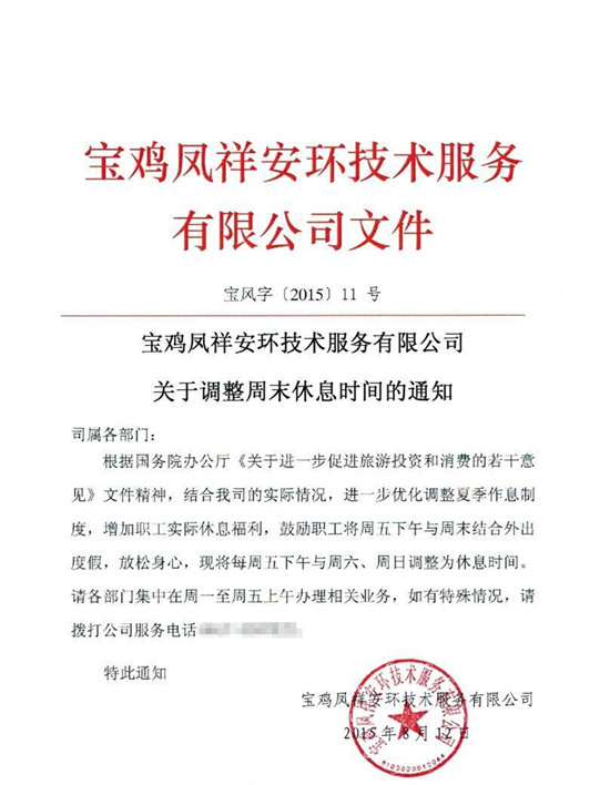 西部网记者看到,这家公司文件发出的关于调整周末休息时间的通知中写到,根据国务院办公厅《关于进一步促进旅游投资和消费的若干意见》文件精神,结合公司情况,将每周五下午与周六、周日调整为休息时间。