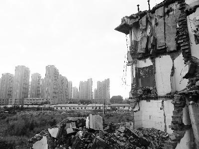 鞍山市建国路旁是谷春立主政时期拆除的断壁残垣和远处尚未建成的高层商住楼 摄/法制晚报深度记者 张恩杰
