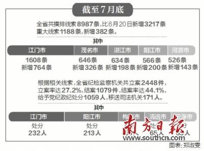 笔者20日从广东省纪委获悉,今年4月底启动的全省纪检监察机关开展农村基层党员、干部违纪违法线索集中排查活动有了新进展。截至7月底,全省共摸排线索8987条,比6月20日新增3217条;重大线索1188条,新增382条。其中,江门市1608条,新增764条;茂名市646条,新增326条;湛江市634条,新增198条;阳江市566条,新增200条;河源市526条,新增143条,居全省前列。
