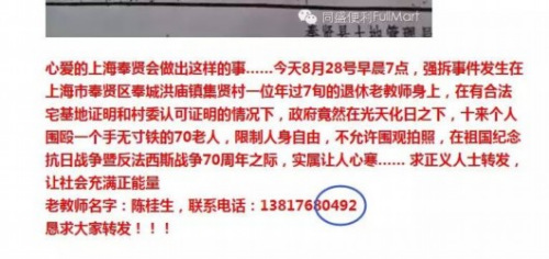 传上海奉城镇强拆时围殴老人 官方紧急辟谣