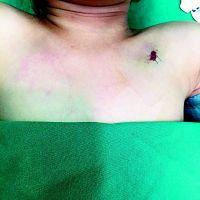 没有哭闹,神志也很清醒,跟正常人一样,只是左侧锁骨下有一个1厘米左右的小伤口。没有人会想到,这样一个不起眼的伤口下面,却有一根8厘米长的铅笔。它从太原5岁女孩豆豆(化名)的锁骨下方斜插进去,穿过密密麻麻的血管,经过胸腔进入肺部,差点危及生命。所幸的是,铅笔避开了所有的要害部位,而且在省儿童医院多个科室医护人员的全力配合下,铅笔没有移位、胸腔没有积血,最后被成功取出。