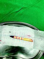 异物一点点地露出来,到3厘米左右时,惊喜出现了,那个一直被大家担心找不见的小异物露出,原来是一小截铅笔芯。此时,医护人员心中的种种猜测也被进一步证实,那根长的应该就是铅笔,之前胸片、CT显示的影像之所以那么细,因为那只是笔芯。