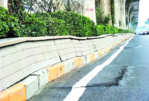 施先生介绍,上周他乘车经过解放大道,在古田二路轻轨站下,发现沥青路面靠中间花坛的位置,竟有波浪状的起伏,桥底下的花坛也出现了砖块拱起和开裂等现象。“不知道会不会影响轻轨桥的安全?”施先生有些担心。