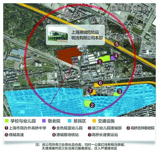 上海港城危险品物流有限公司有三处危化品仓库,均对1千米红线有相当突破,天津港爆炸后三处仓库开始搬离原址。